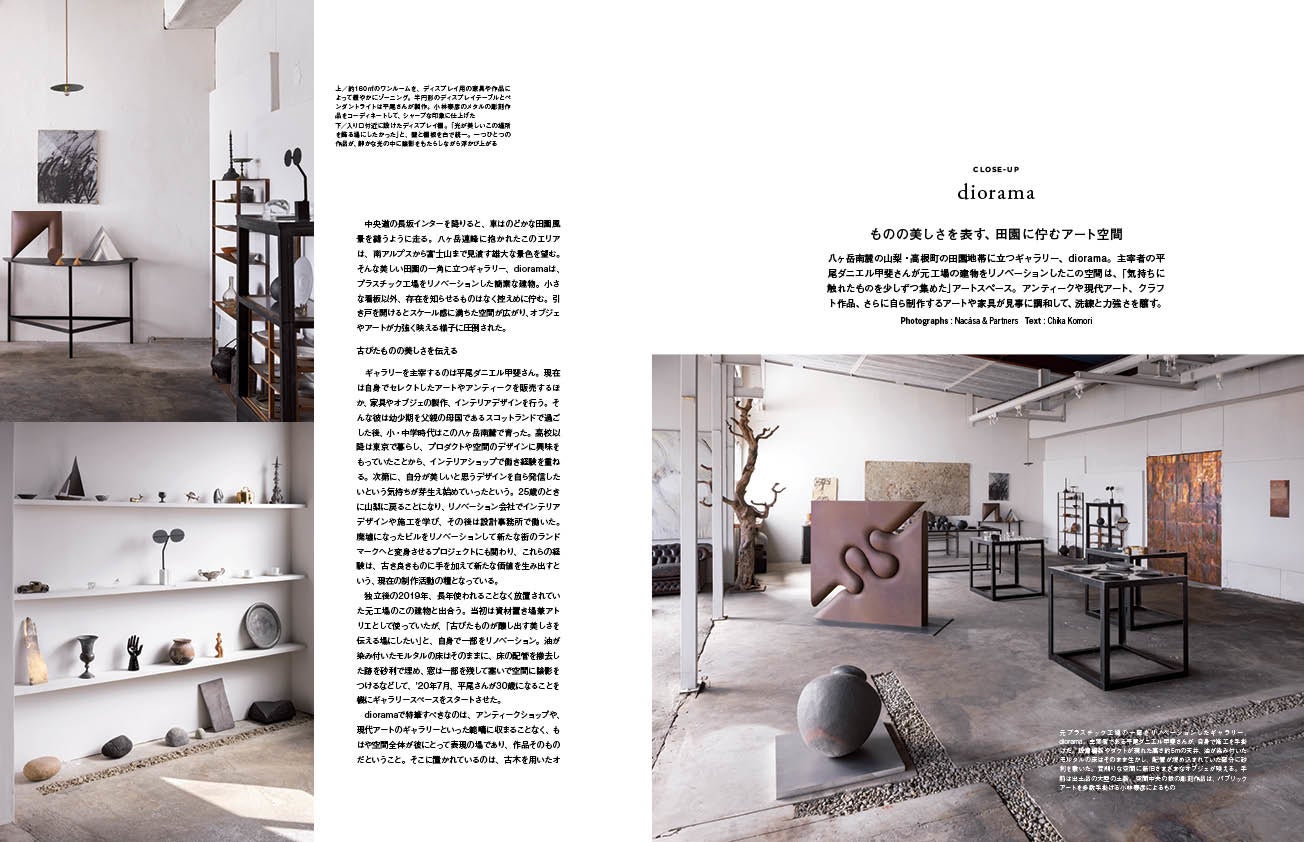 八ヶ岳南麓の山梨・高根町の田園地帯に立つギャラリー、diorama。主宰者の平尾ダニエル甲斐さんが元工場の建物をリノベーションしたこの空間は、「気持ちに触れたものを少しずつ集めた」アートスペース。アンティークや現代アート、クラフト作品、さらに自ら制作するアートや家具が見事に調和して、洗練と力強さを醸します。