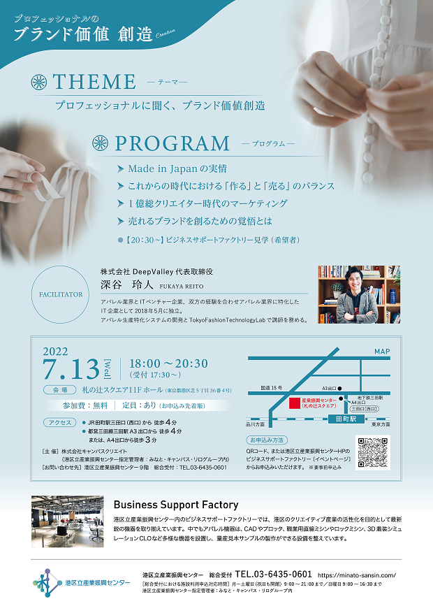 申し込み方法:港区立産業振興センターHPビジネスサポートファクトリーイベントページよりお申込みいただけます。