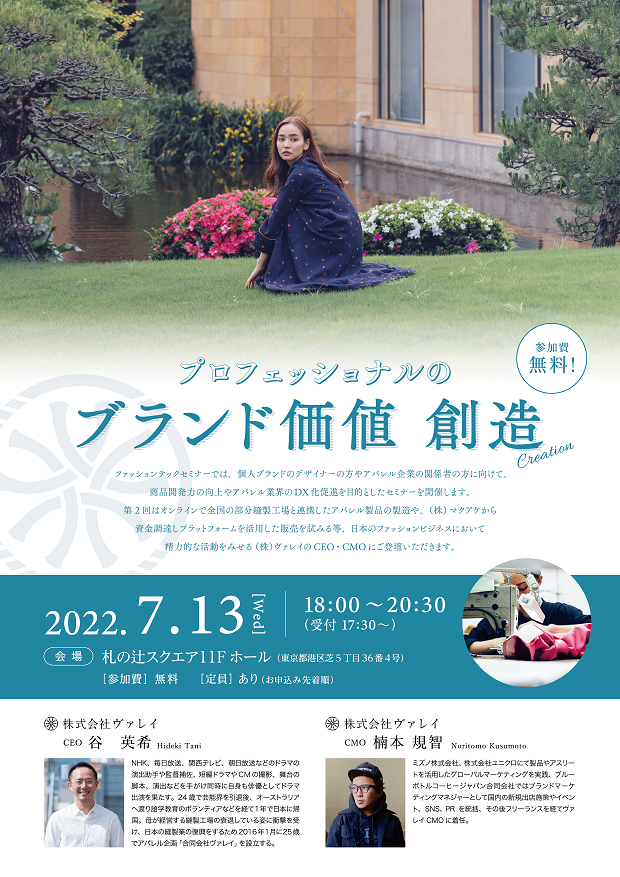 第2回はオンラインで全国の部分縫製工場と連携したアパレル製品の製造や、(株)マクアケから資金調達しプラットフォームを活用した販売を試みる等、日本のファッションビジネスにおいて精力的な活動をみせる(株)ヴァレイのCEO・CMO にご登壇いただきます。
