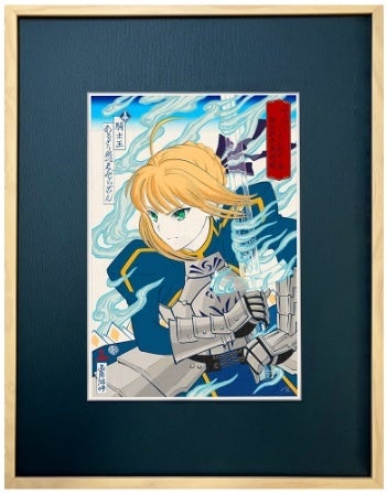 セイバー/アルトリア・ペンドラゴンの姿を江戸の庶民の間でも人気を博した役者絵(武者絵)の大首絵としてダイナミックかつ繊細に表現しました。宝具・風王結界(インビジブル・エア)を纏い透明化したエクスカリバー(約束された勝利の剣)も浮世絵らしい風合いで描き上げています。
