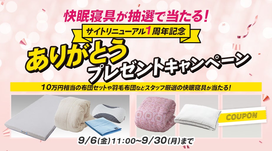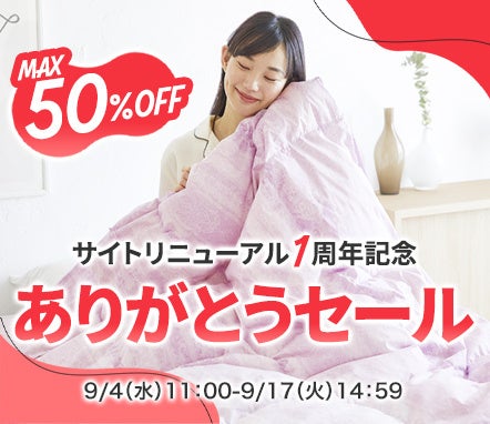 さらに人気の快眠寝具が最大50%OFFになるサイトリニューアル1周年記念ありがとうセールも開催いたします。