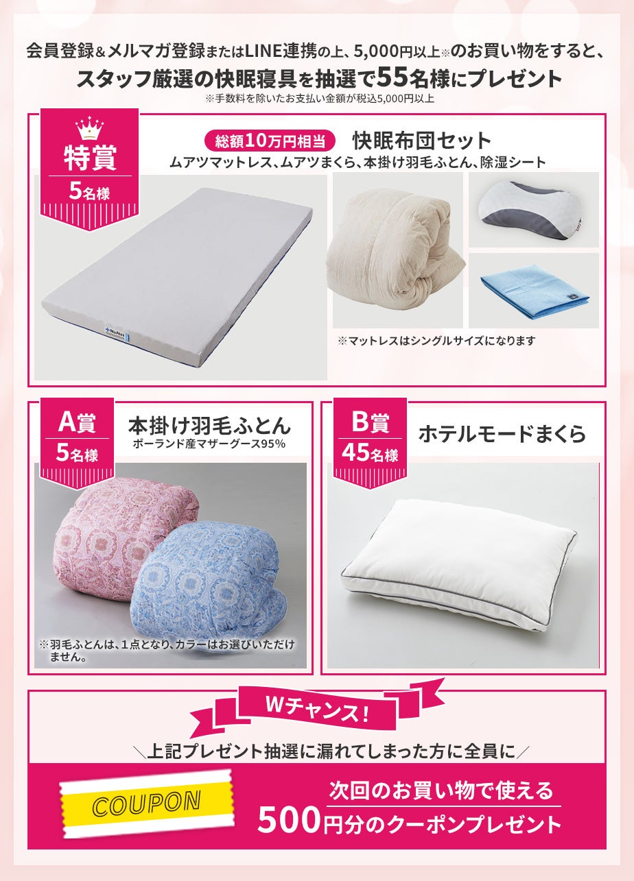 ロングセラー商品のムアツマットレスを含む10万円相当の布団セットをはじめ、スタッフ厳選の快眠寝具をプレゼント。