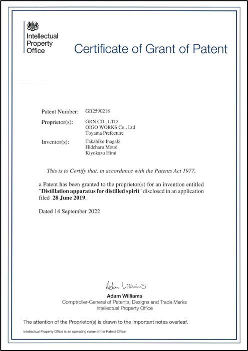 ●世界初鋳造製ポットスチル「ZEMON(ゼモン)」 英国での特許取得について
