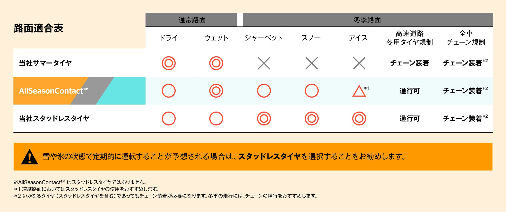 コンチネンタルの「AllSeasonContact」は、四季を通じて気温や突然の天候の変化に対応することで、様々な路面条件下*2)でも安心感をもって走行でき、より高い安全性を確保することを目標に開発されたオールシーズンタイヤです。