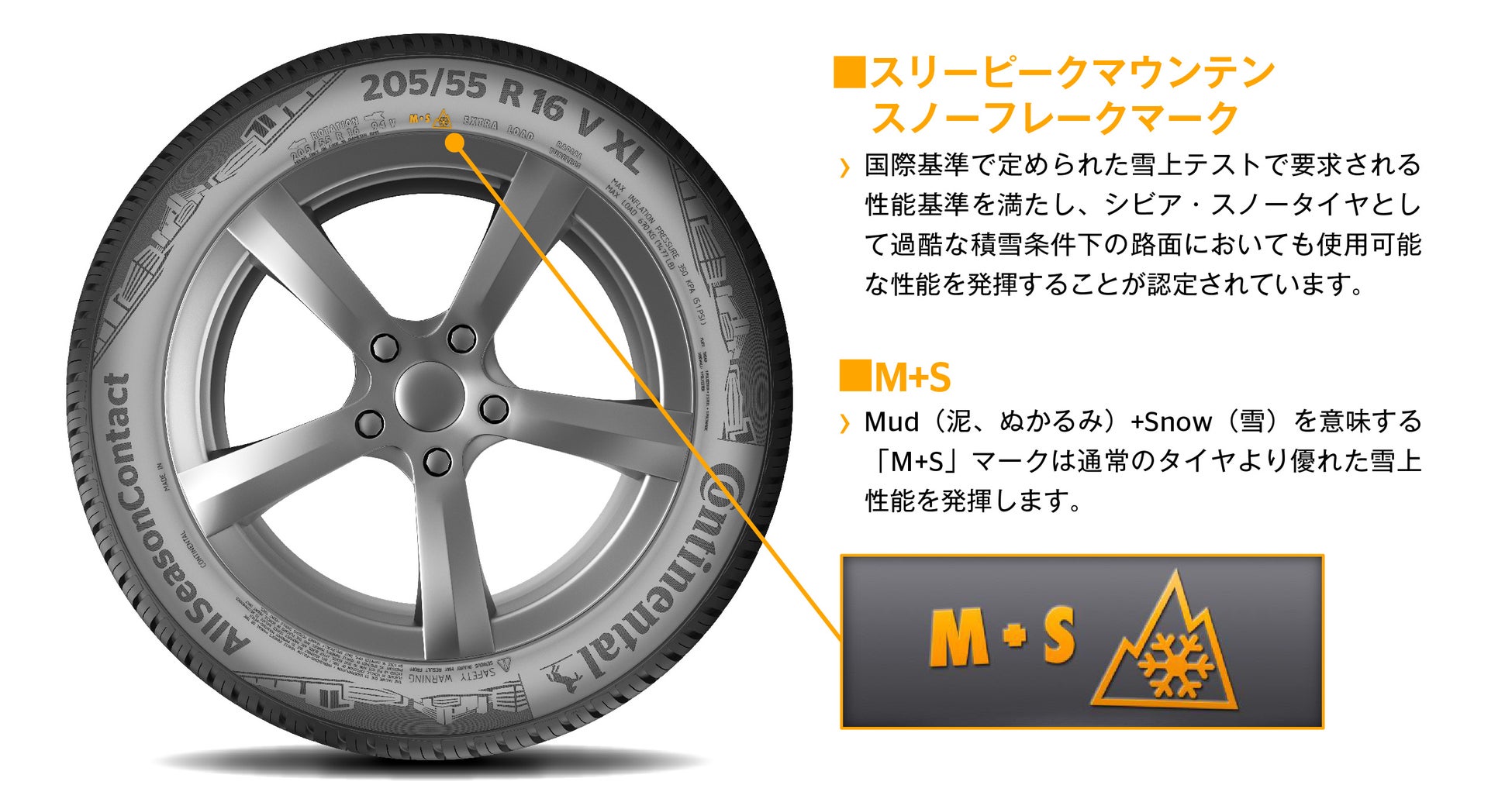 4.雪上*3)での高い走行性能と安全性が認められたことを示すサイドウォールの刻印『スリー・ピーク・マウンテン・スノーフレーク』と『M+S』