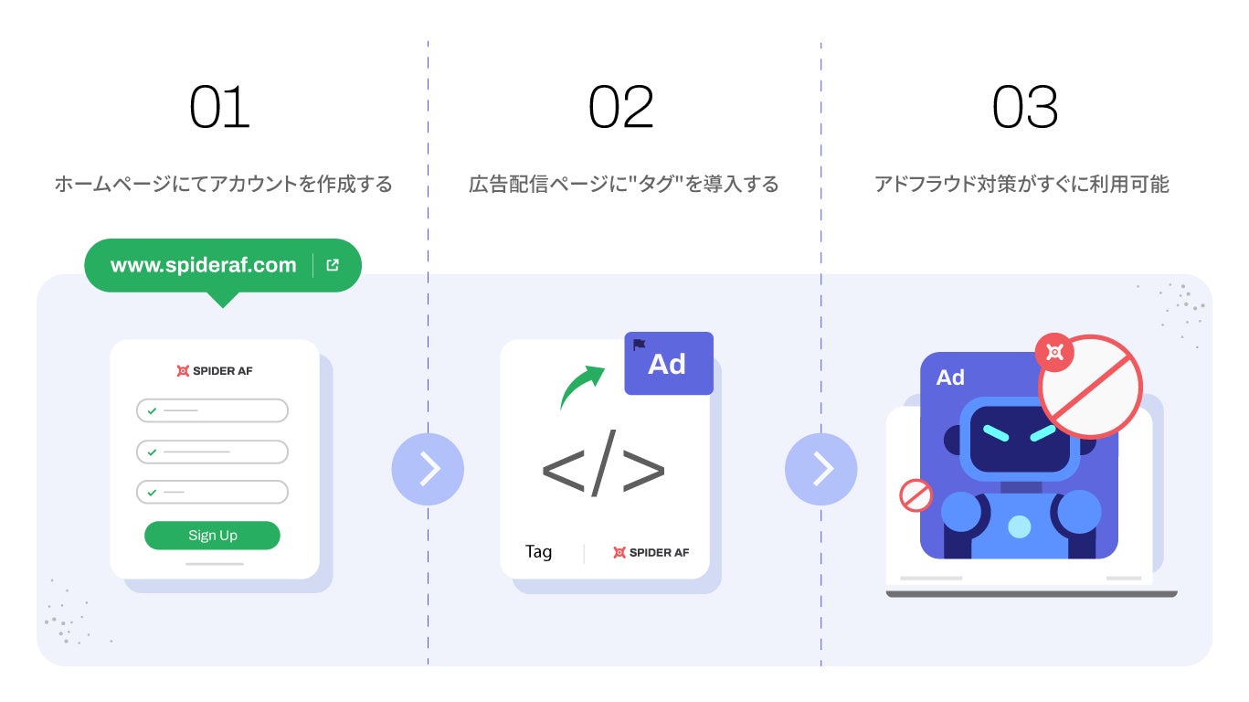 このような背景を受けてSpider AFではすでにアドフラウドを検知してブロックする対策を行ってきました。今回のアップデートでは業種業態や企業体の規模、さらには国内外問わず全媒体に向けてご利用いただけるようにホームページ上より登録から最短5分でアドフラウド対策が可能となる大型アップデートを行いました。