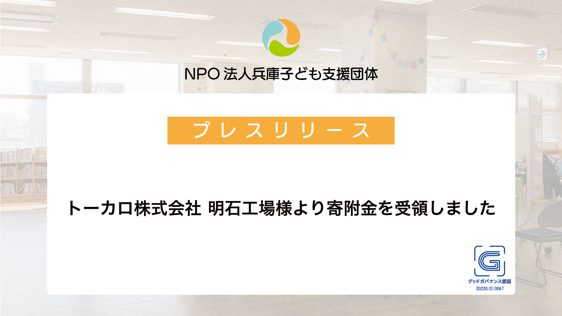 認定NPO法人兵庫子ども支援団体(所在地:兵庫県明石市、代表理事:多田実乘、以下「当法人」という)はこのたび、トーカロ株式会社 明石工場様(所在地:兵庫県明石市)より寄附金をいただいたことをお知らせいたします。同社からの寄附は2023年より3度目の受領となります。頂いた寄附金は、当法人が実施する学習支援や子どもの居場所づくり、体験活動、物品支援の提供のために使わせていただきます。