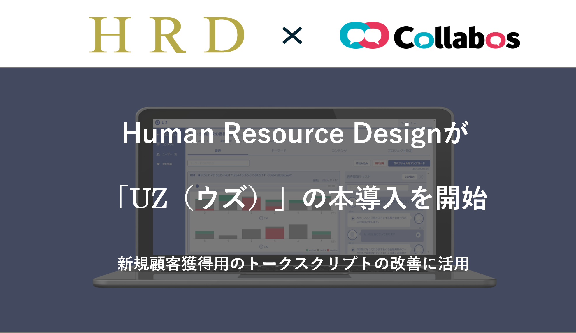 コールセンターシステムやマーケティングシステムを開発し、月額制のクラウド型で提供している株式会社コラボス(本社:東京都千代田区、代表取締役社長:茂木 貴雄、以下「当社」)は、2023 年12月21 日にリリースした最新AI マーケティングシステム「UZ(ウズ)」が、各種採用コンテンツサービスを提供する株式会社Human Resource Design Design(本社:東京都港区、代表取締役:松村 恭行、以下「HRD 社」)に採用されましたことをお知らせいたします。