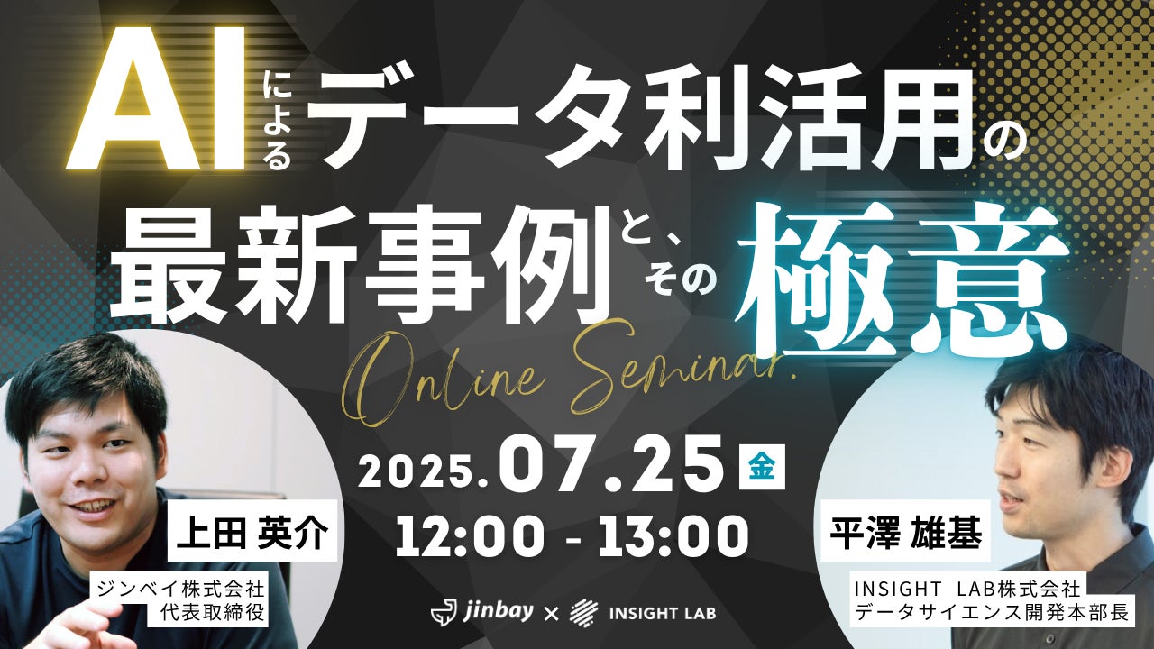 INSIGHT LAB株式会社(本社:東京都新宿区、代表取締役社長:遠山 功、以下「INSIGHT LAB」)は、ジンベイ株式会社(本社:神奈川県横浜市、代表取締役:上田 英介、以下「ジンベイ」)と共催で、「AIによるデータ利活用の最新事例とその極意」についての無料オンラインセミナーを2025年7月25日(金)に開催いたします。