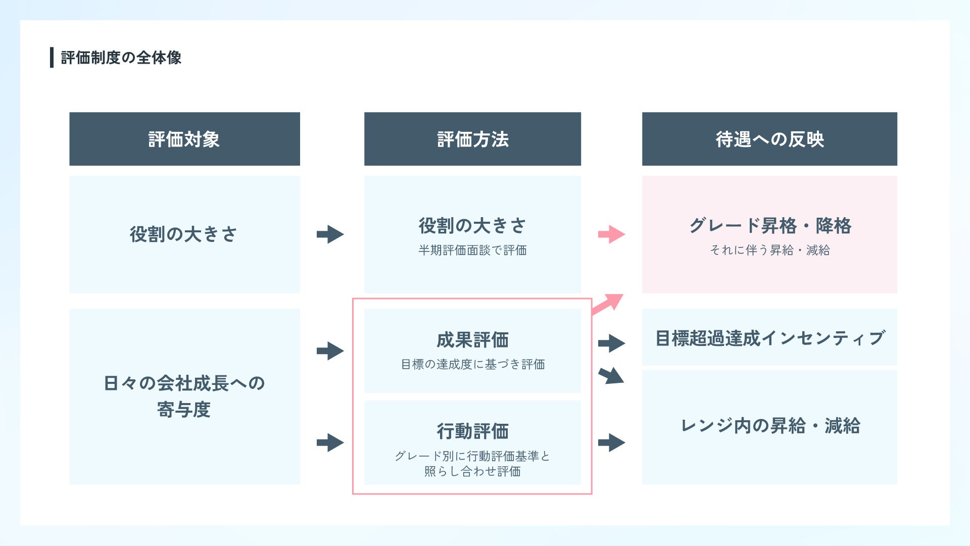 社員の成長と組織の目標達成を両立し、より本質に焦点を当てた動きができる組織にすべく、目標達成に基づくインセンティブ制度へ変更しました。また、明確化されていなかった報酬レンジを各グレードごとの適切な報酬レンジに設定しました。