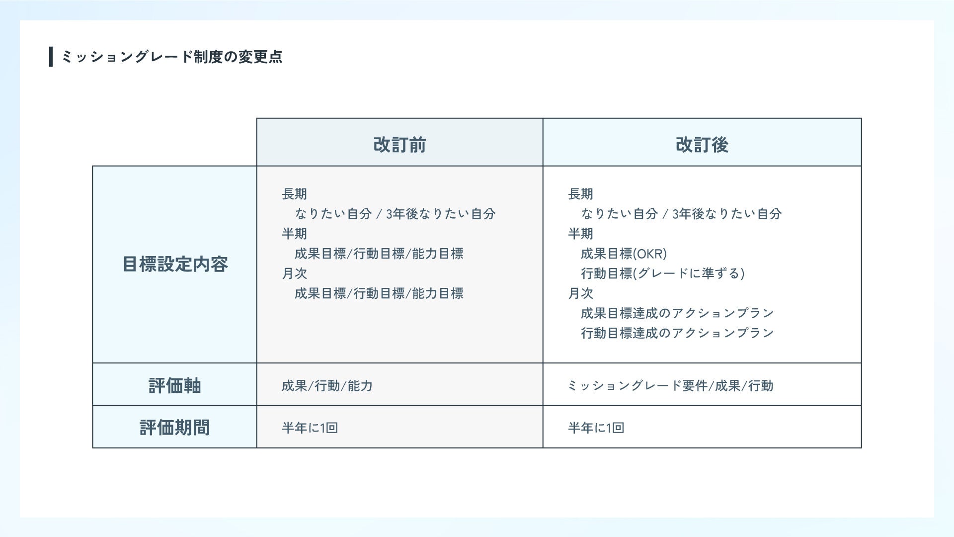 <変更点> ・ミッショングレード制度の定義を土台に目標設定を行い、定量評価と定性評価いずれも行う。 ・月次面談で期待値の認識合わせを行い、フィードバックをすることで成長意欲を醸成。 ・評価者間での目線合わせを行うことで、目標設定の公平性を担保。 |