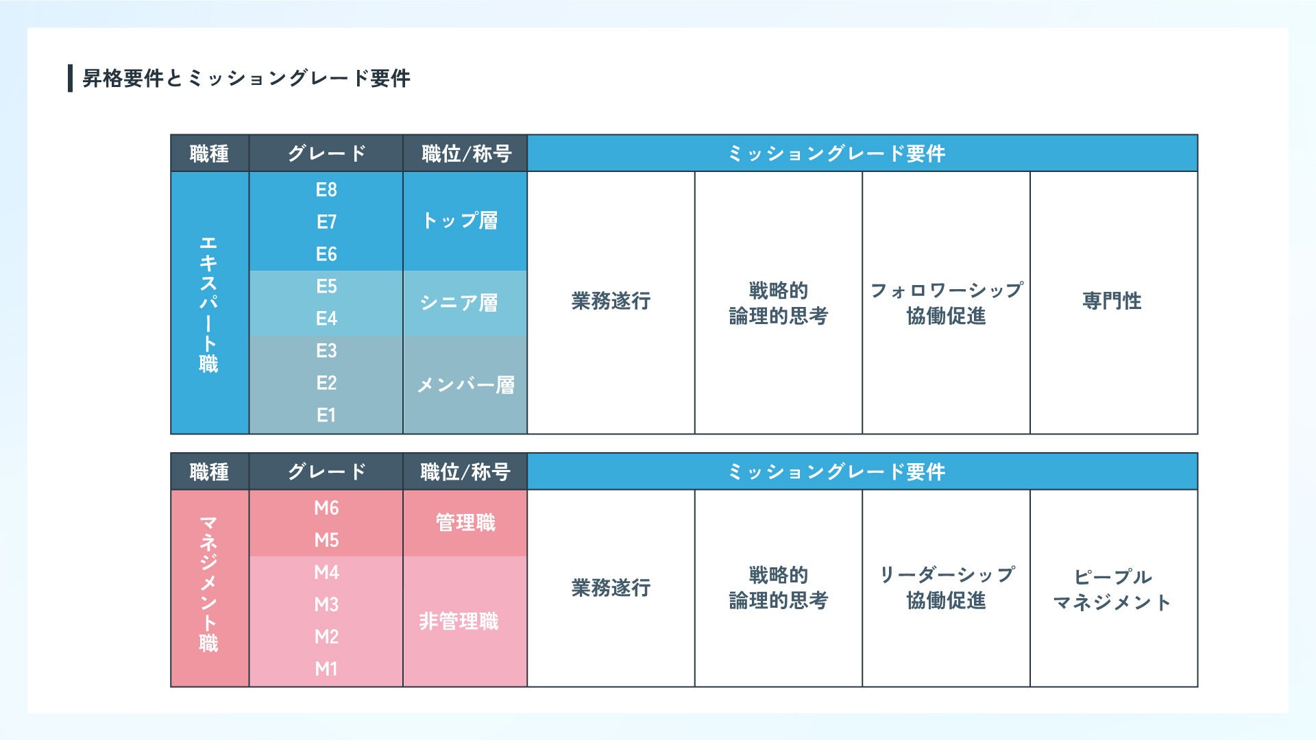これを踏まえ、年齢や役職、キャリアに関係なく社員が担う役割に応じてグレードを決める「ミッショングレード制度(役割等級制度)」に変更し、グレード区分及び求める能力を設計しました。これにより、社員一人ひとりが明確な成長目標を持ち、自身のキャリアを主体的に設計することが可能となります。