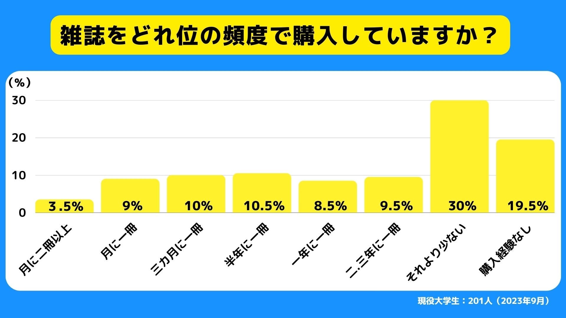調査の結果、雑誌の購入経験のない大学生は約5人に1人の19.5%に上り、毎月雑誌を購入している大学生は12.5%という結果になりました。