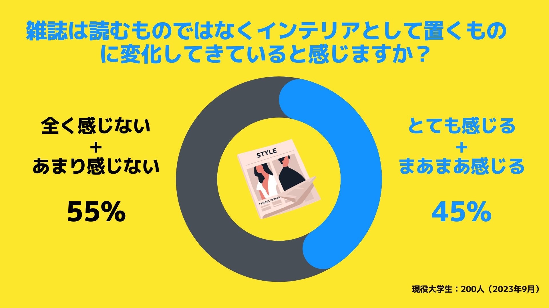 また、雑誌に関して当社所属の大学生ライターから「雑誌をインテリアとして買うことはある」との発言があったことから、その実態を調査した結果「雑誌は読むモノではなく、インテリアとして置くものに変化してきていると感じますか?」という設問に対して、その実感がある大学生は45%に上ることが判明しました。