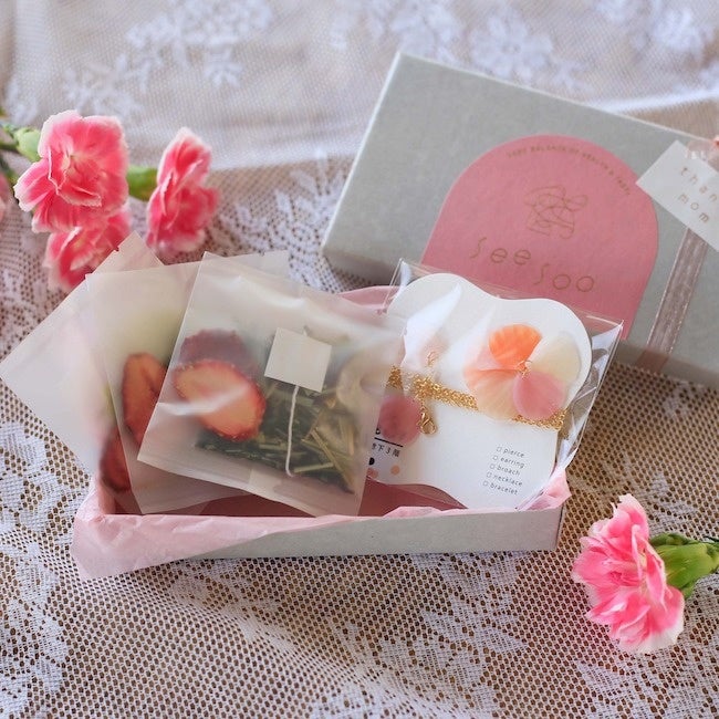 ブレンドティーを取り扱うブランド「seesoo」とポリマークレイアクセサリーブランドの「地下3階」がコラボレーション。いちごが香る日本茶ブレンドティーとマスクストラップがセットになった、この春限定のギフトボックスです。
