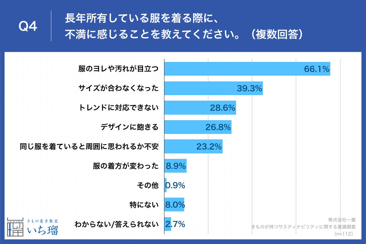 - 約7割が、長年所有している服を着る際に、服のヨレや汚れが目立つことに不満