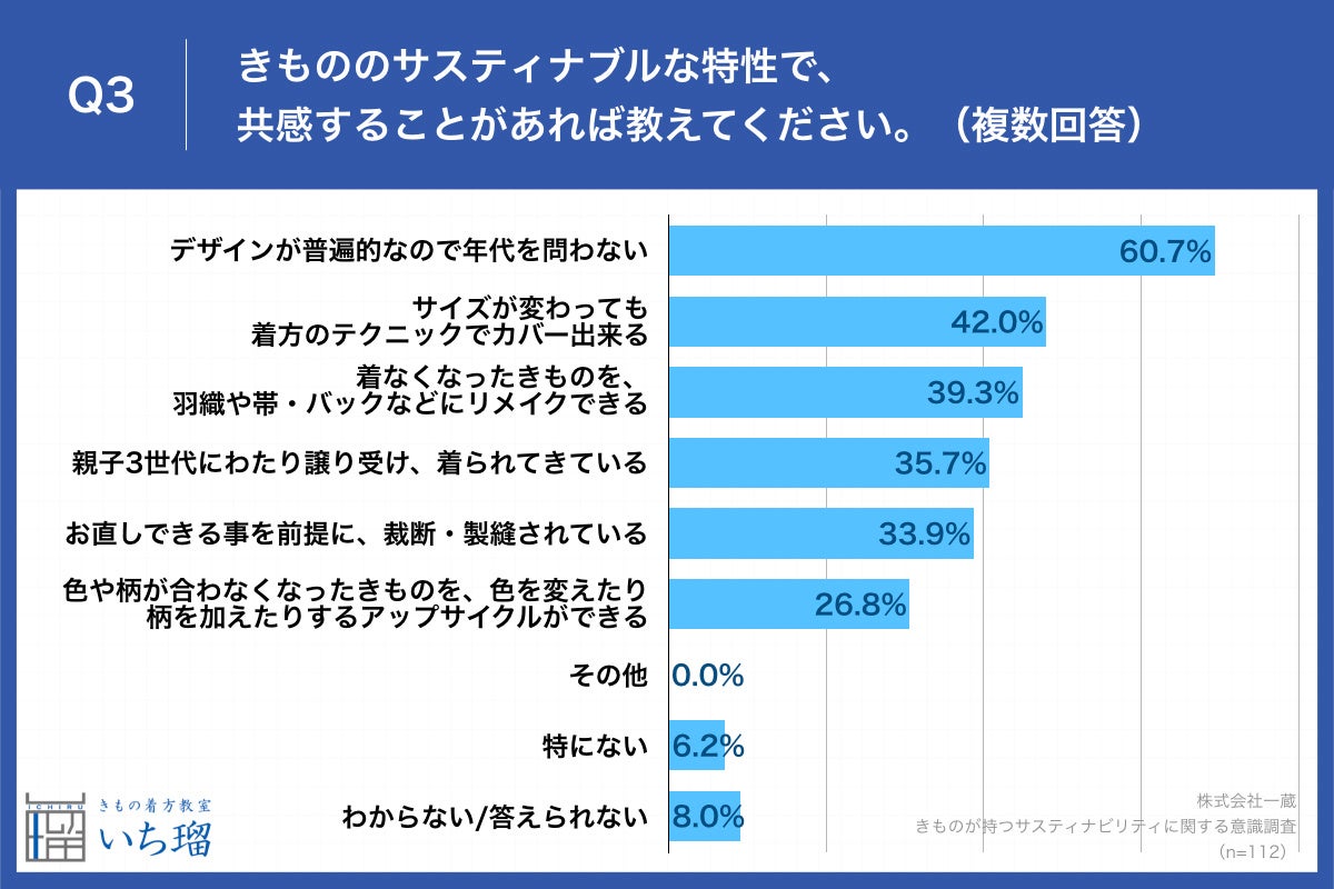 - きもののサスティナブルな特性で共感すること、「デザインが普遍的なので年代を問わない」が60.7%で最多