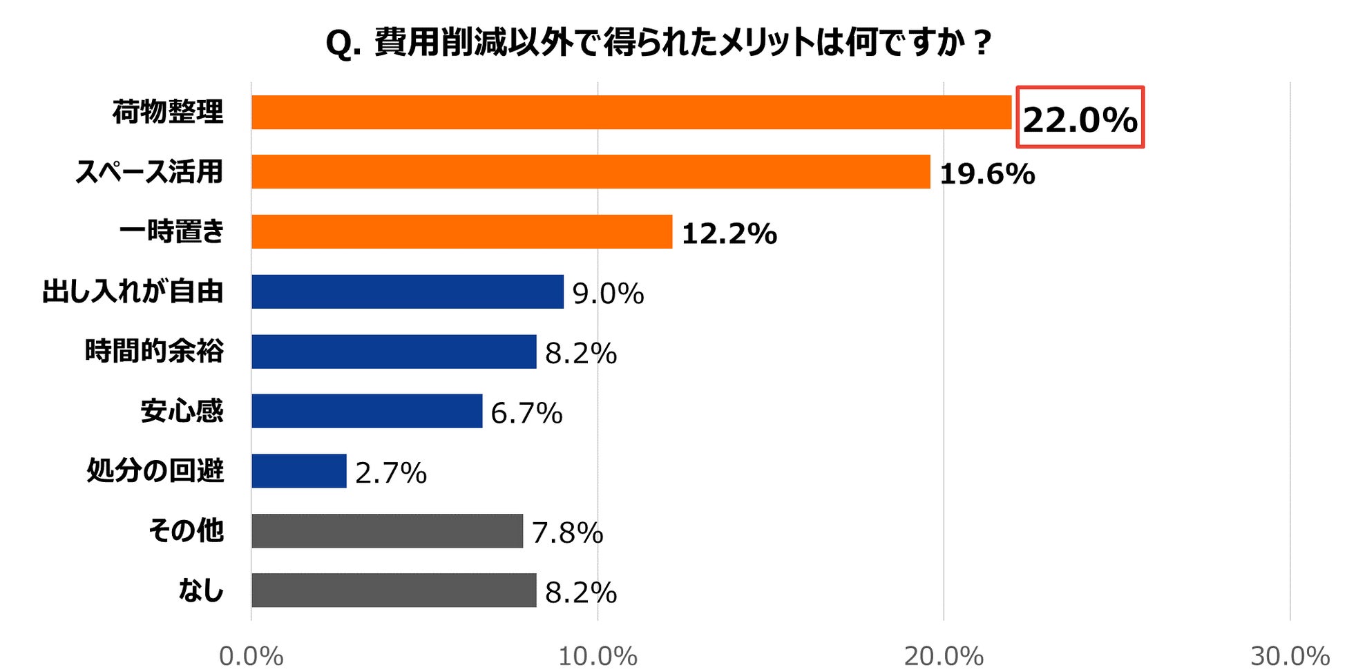 「荷物整理」(22.0%)、「スペース活用」(19,6%)、「一時置き」(12,2%)と引越し時の悩みを解決するメリットを感じる利用者が多い結果に。