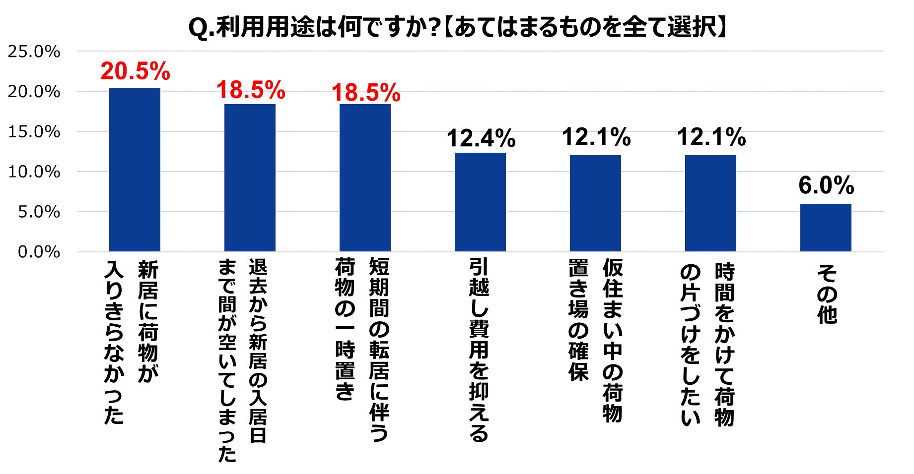 トランクルームを利用する理由で最も多かったのは、「新居に荷物が入りきらなかった」が20.5%と、新居の収納スペースの代用として活用し始めた利用者が多い。