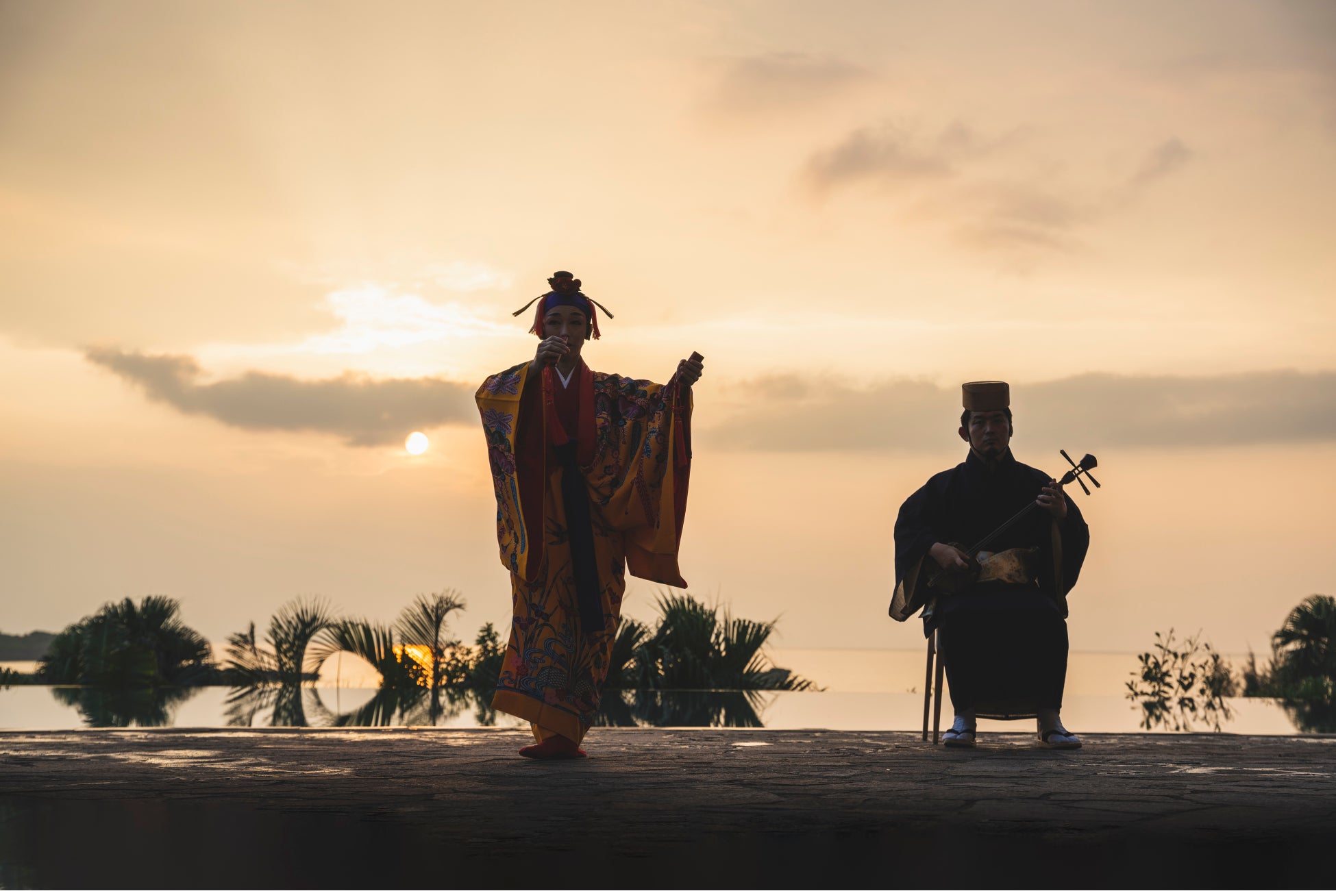 かつては、首里城内に特設舞台が設置され、宴を盛り上げた芸能。瀬良垣島では、東シナ海に沈む美しい夕日を望む、屋外テラス席が芸能の舞台となります。開放的でプライベートな空間の中、食前酒とともに響される、古典音楽と舞踊を間近で愉しむひととき。演奏・演舞の合間には、演目の歴史や背景などを演者自らお客様に解説いたします。