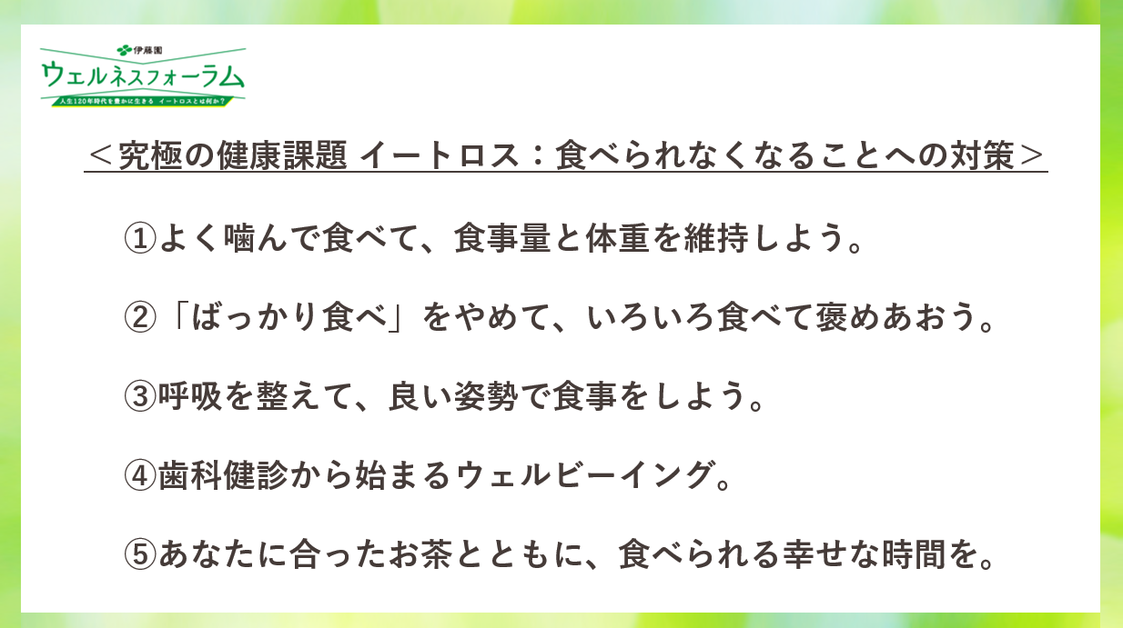 本フォーラムは、「人生120年時代を豊かに生きる イートロスとは何か?」をテーマに開催。