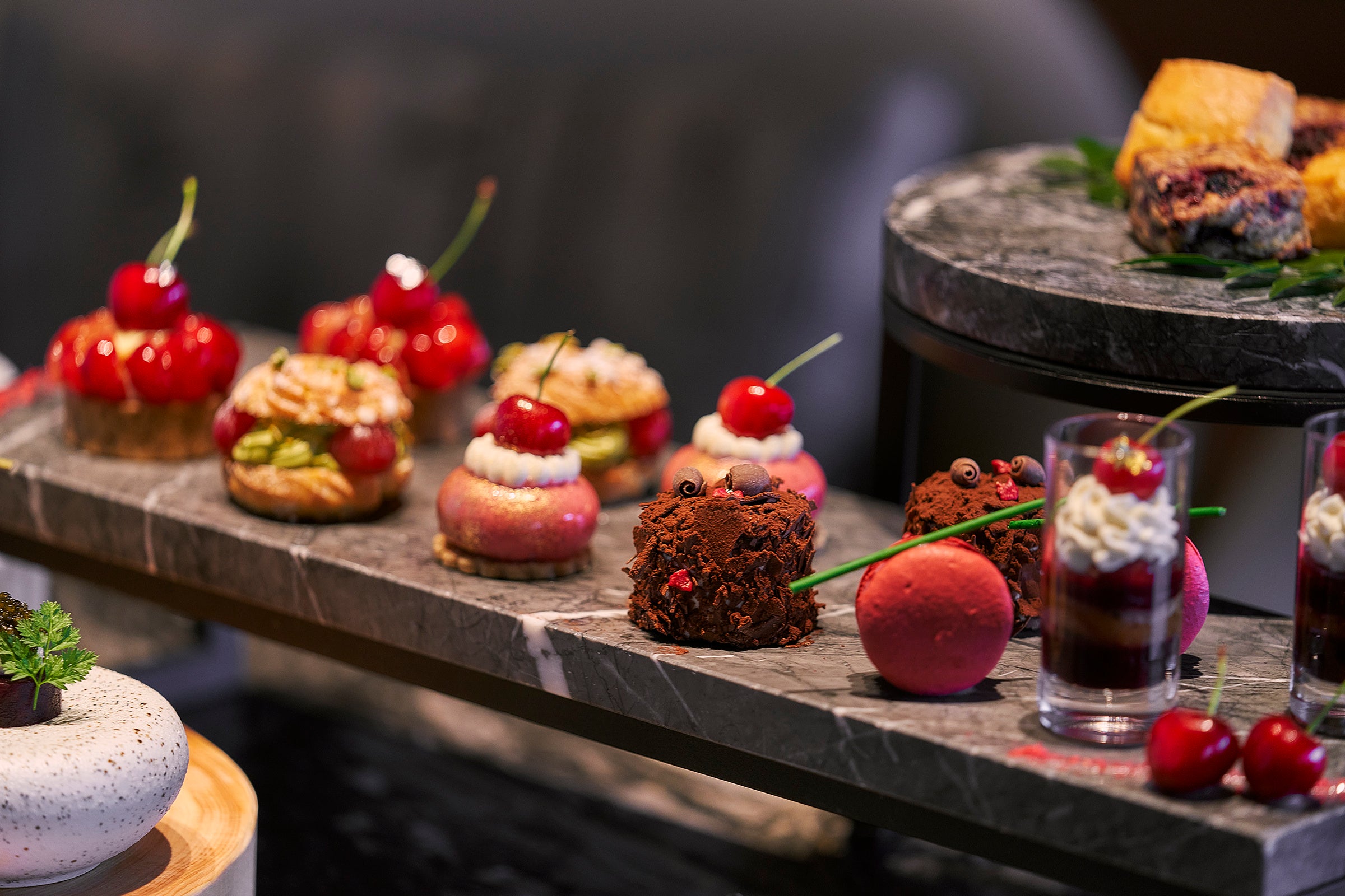 初夏の季節のさくらんぼとチェリーを贅沢に使った色鮮やかな7種類のスイーツと、五味(苦味、うま味、酸味、塩味、甘味)を表現したこだわりのセイボリー5種で構成しています。