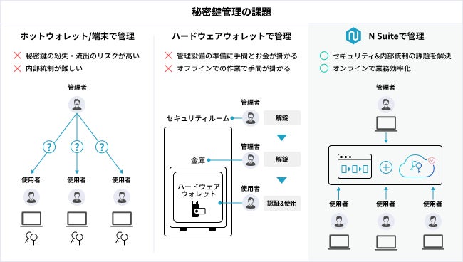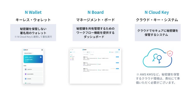 N Suiteは、NFTの発行などに必要なブロックチェーンの秘密鍵を、企業が安全かつ効率的に管理することができるサービスです。秘密鍵をクラウドで共有管理可能にするとともに、ワークフロー機能によって、管理者の承認に基づいて秘密鍵が使用される仕組みを提供します。