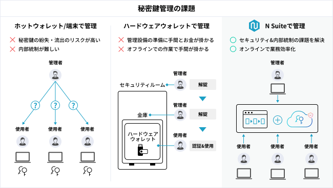 通常、企業がセキュリティと内部統制の要件を満たす秘密鍵管理をするには、ハードウェアウォレットを使用するなど、オフラインの設備と作業が必要となります。N Suiteの共有管理とワークフロー機能を活用することで、WEB画面から全ての作業をオンラインで完結させることができます。