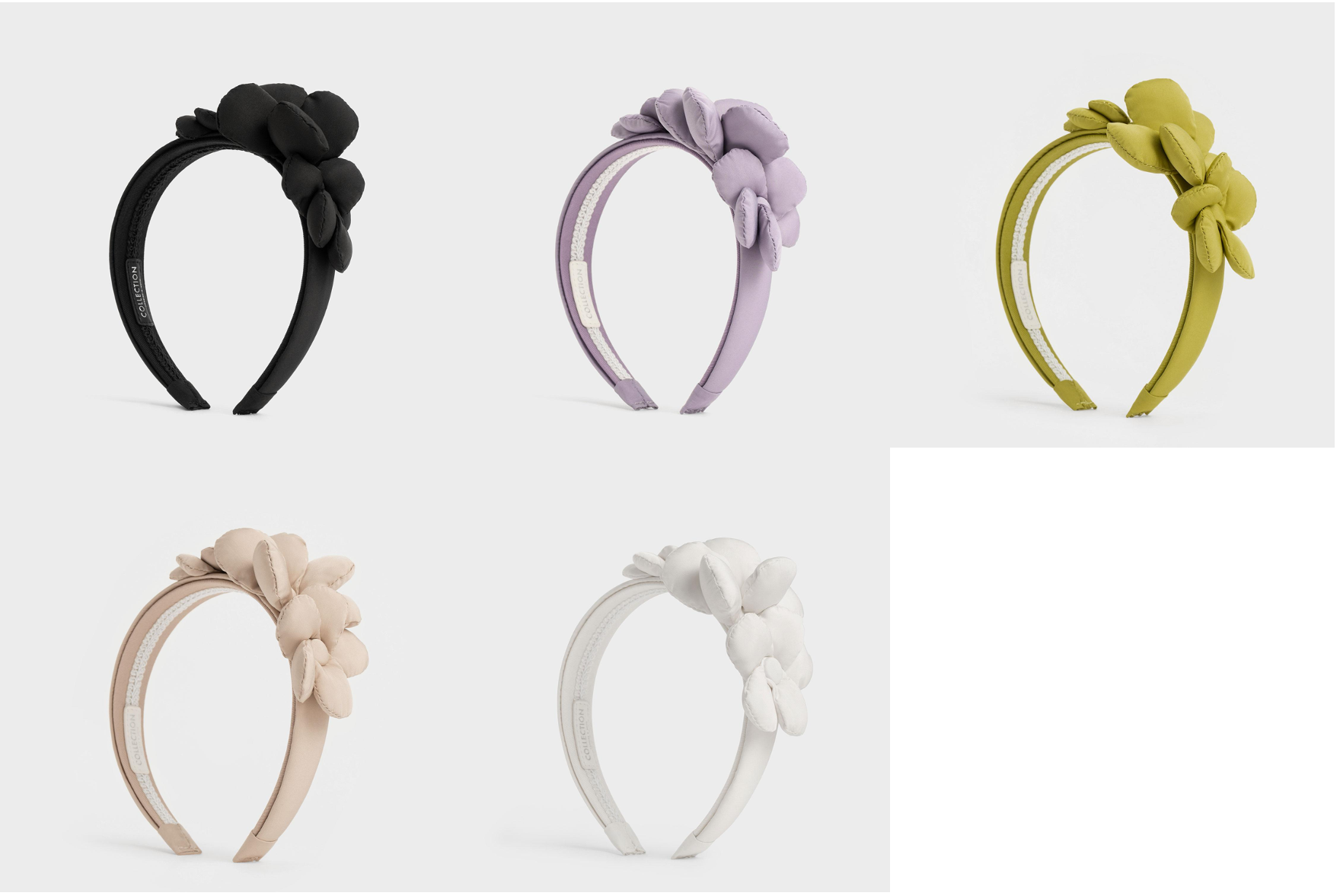 また、自然からインスピレーションを得たフラワーモチーフのハンドバッグとヘアバンドは、ファッション性と機能性を兼ね備え、ドラマチックな雰囲気を演出します。