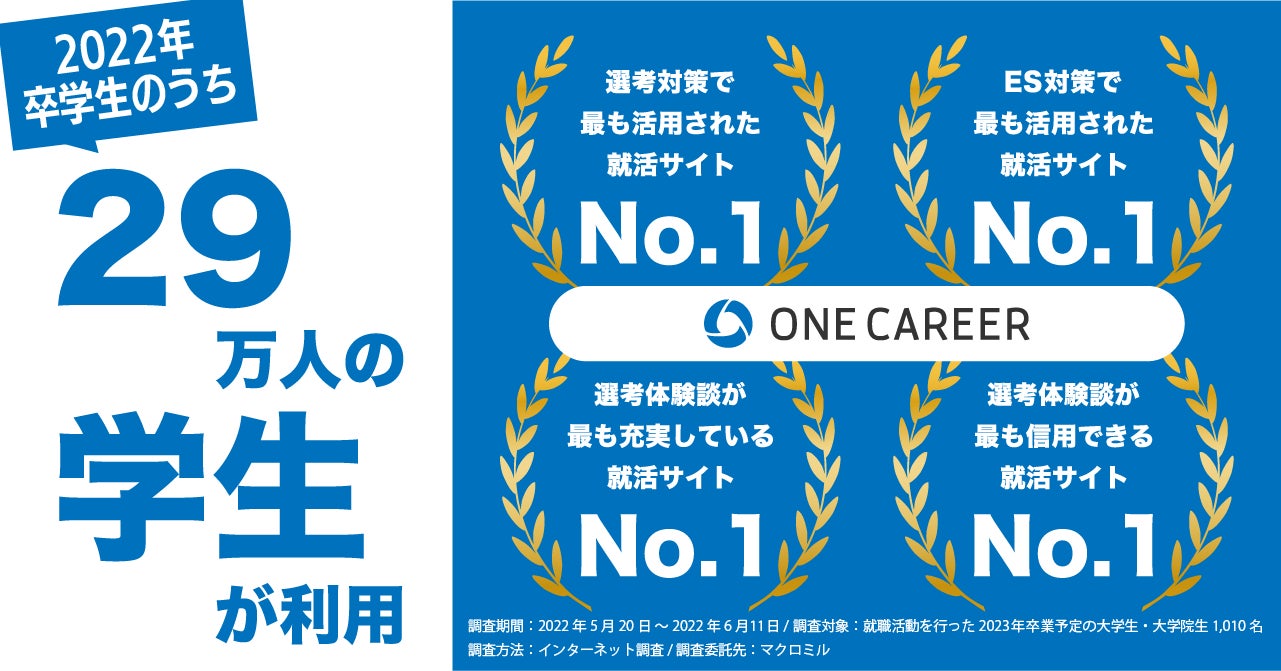 株式会社ワンキャリア(本社:東京都渋谷区、代表取締役社長 宮下尚之、以下ワンキャリア)が運営する就活サイト「ONE CARRER」は、2022年5月に実施されたインターネット調査にて、「選考対策で最も活用された就活サイト」など4つの項目でNo.1を獲得したことをお知らせいたします。