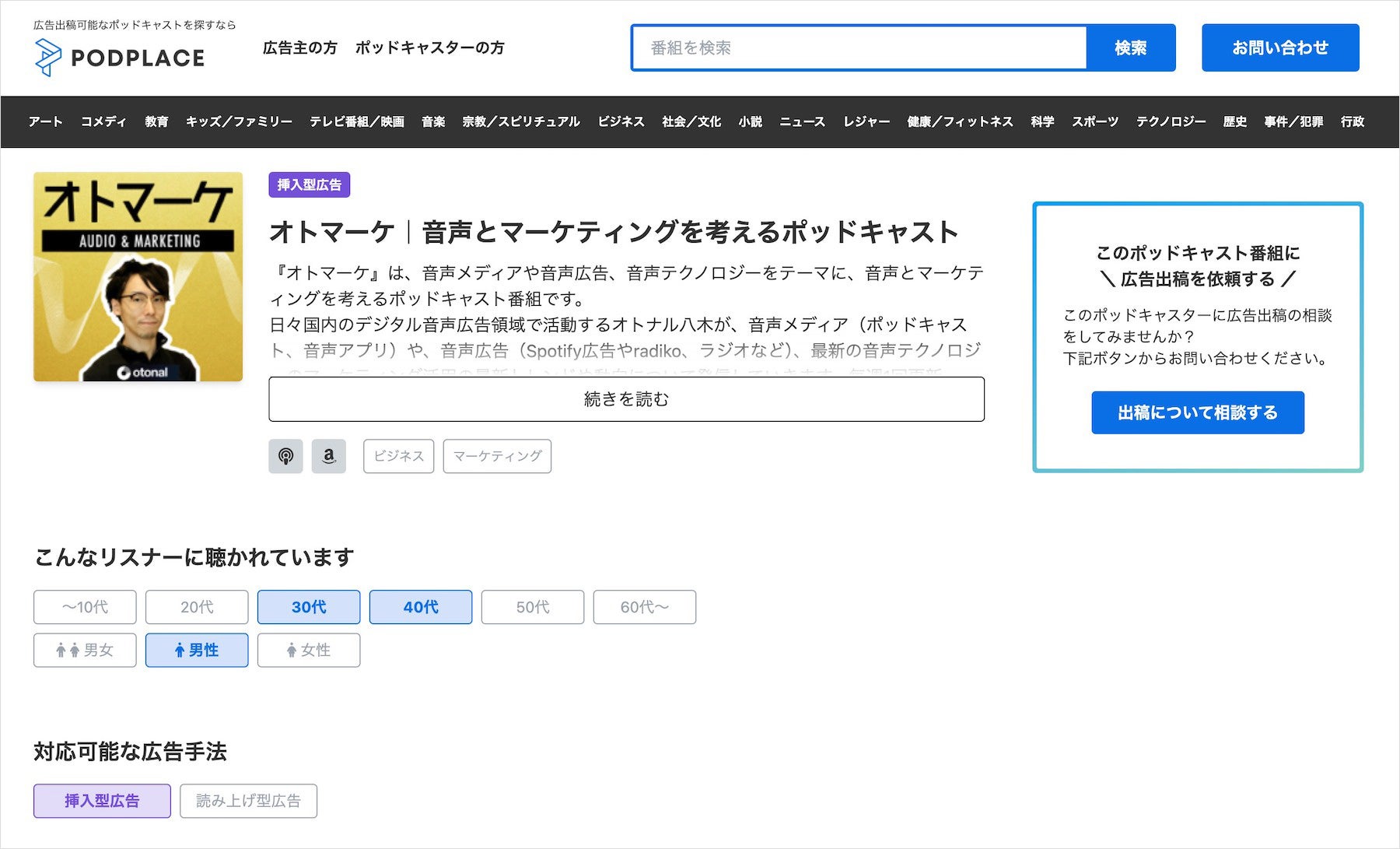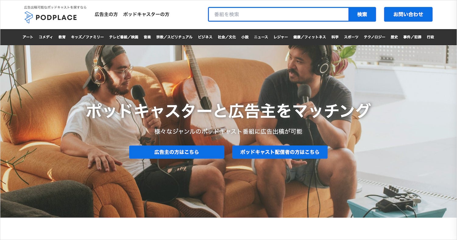 「PODPLACE(ポッドプレイス)」は、ポッドキャスト配信者と広告主をつなぐウェブサイトです。広告主は20以上のジャンル、300以上のポッドキャスト番組に音声広告を出稿することができます。