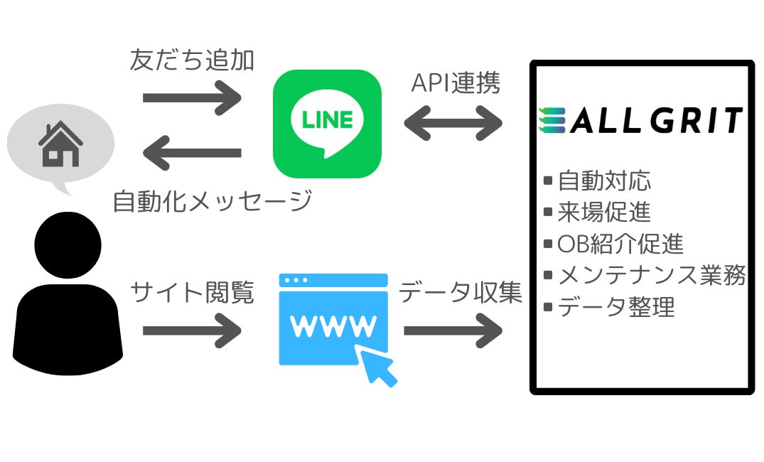 ALL GRIT(オールグリット)は、LINEを活用して集客・営業をbot化することができる、住宅業界に特化したマーケティングオートメーションツール(MAツール)です。