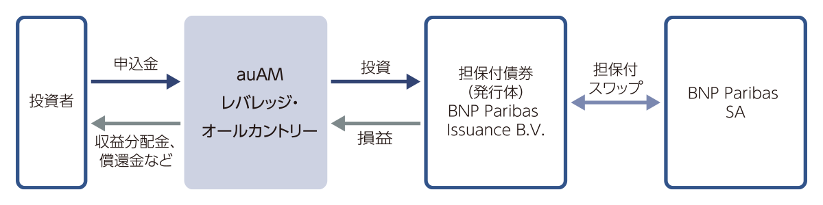 1. BNP Paribas SAを相手方とした担保付スワップ取引を通じて、MSCIオールカントリー・ワールドインデックス(配当込み、米ドルベース)を円建て評価した場合の値動きの2倍程度に連動することを目指します。 2. BNP Paribas Issuance B.V.及びBNP Paribas SAは債券の評価額に相当する担保を差し入れ、担保は保管会社によって分別管理されます。 |