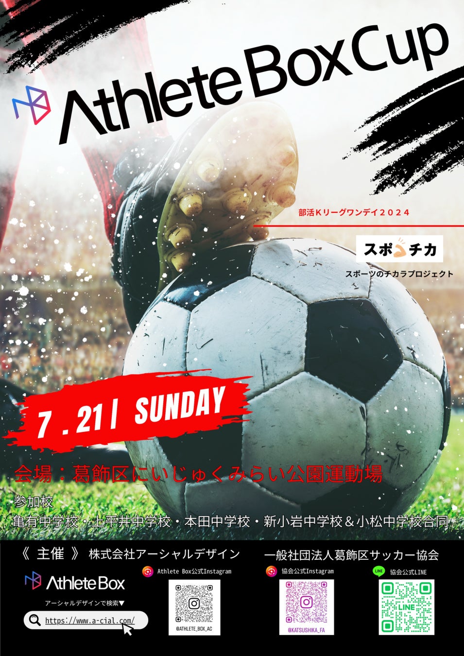 株式会社アーシャルデザイン(本社:東京都渋谷区、代表取締役CEO:小園翔太)が運営する「AthleteBox(アスリートボックス)」と(一財)葛飾区サッカー協会と共催で、葛飾区内の公立中学校5校が参加するサッカー大会「AthleteBox CUP」を2024年7月21日に開催します。