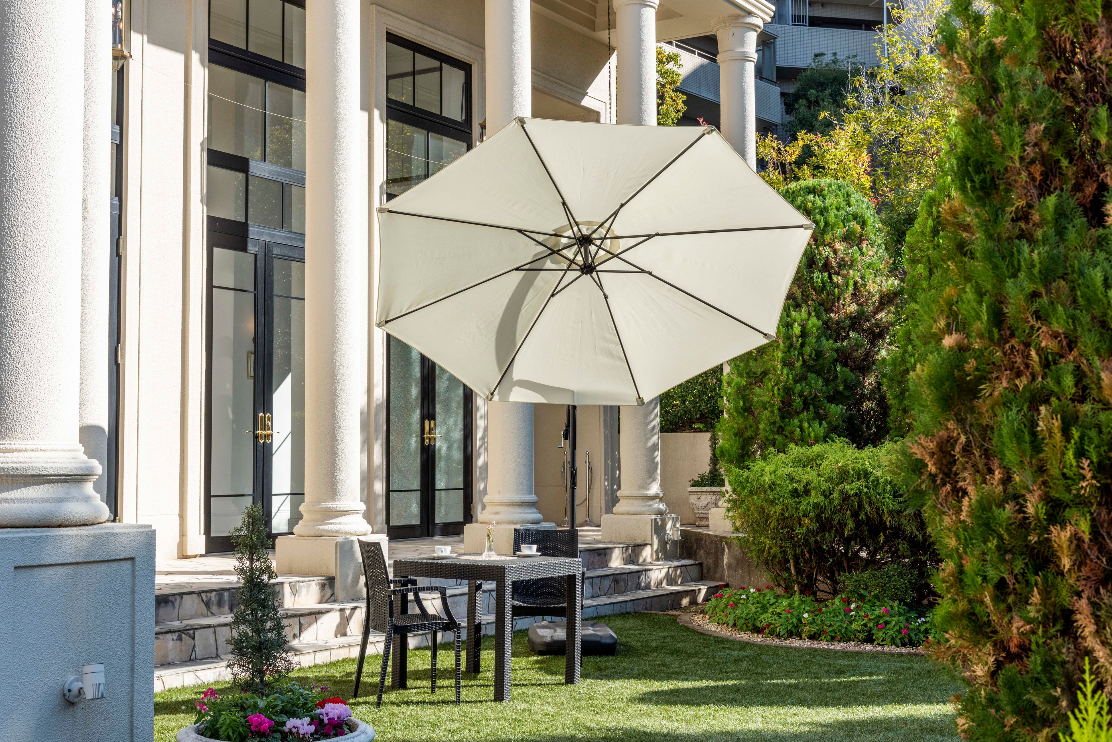 支柱のない吊り下げタイプで、レバーとハンドル操作だけで、角度と高さが簡単に調整できます。パラソルは、直径約300cm設計で広範囲をカバー、紫外線をしっかりカットします※。