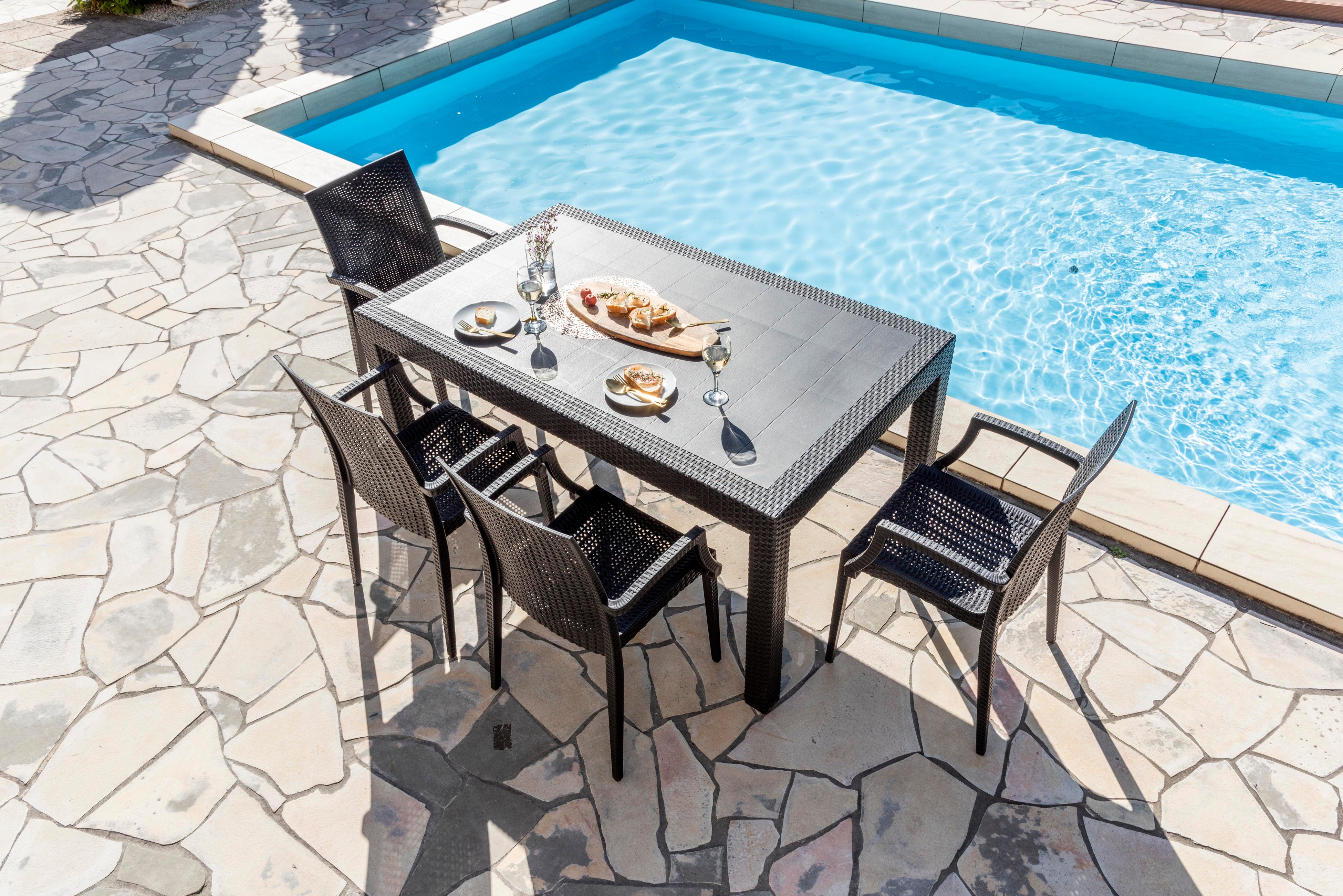 自由にレイアウトを組み替えることで、自分だけのくつろぎ場所がつくれます。人工木(木粉:ユーカリ)を使用し、耐腐朽に優れ、水や紫外線にも強く劣化がしにくい仕上がりにしました。