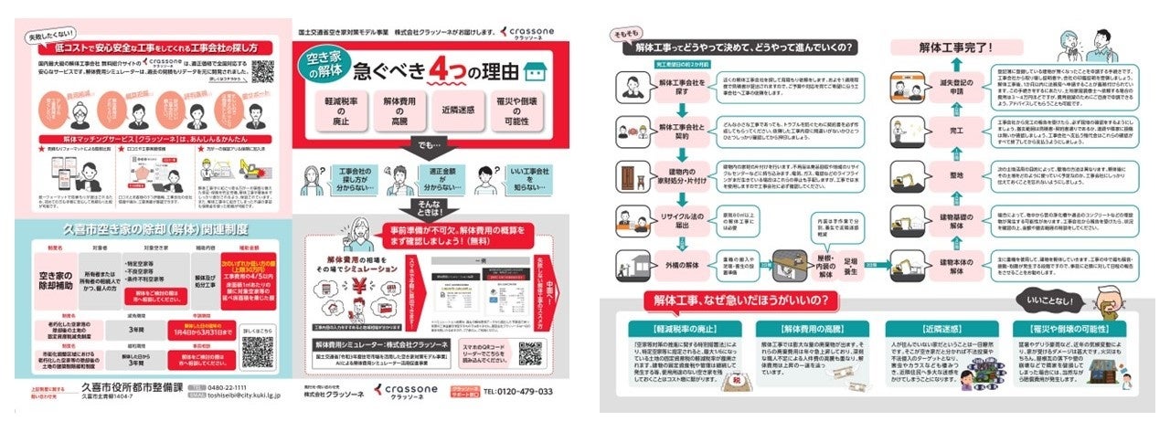 連携協定の取り組みの中で、解体工事の進め方や各自治体の情報を掲載したフライヤーを無償で提供しています。固定資産税の納税通知書や空き家所有者への指導文書に同封し、管理不全空き家の所有者への啓蒙や除却・管理の促進を図っています。フライヤーには解体費用シミュレーターのQRコードも掲載しており、これをきっかけに解体工事の検討を進め、実際に当社の一括見積もりサービスにて工事会社の選定を行っている空き家所有者もいます。