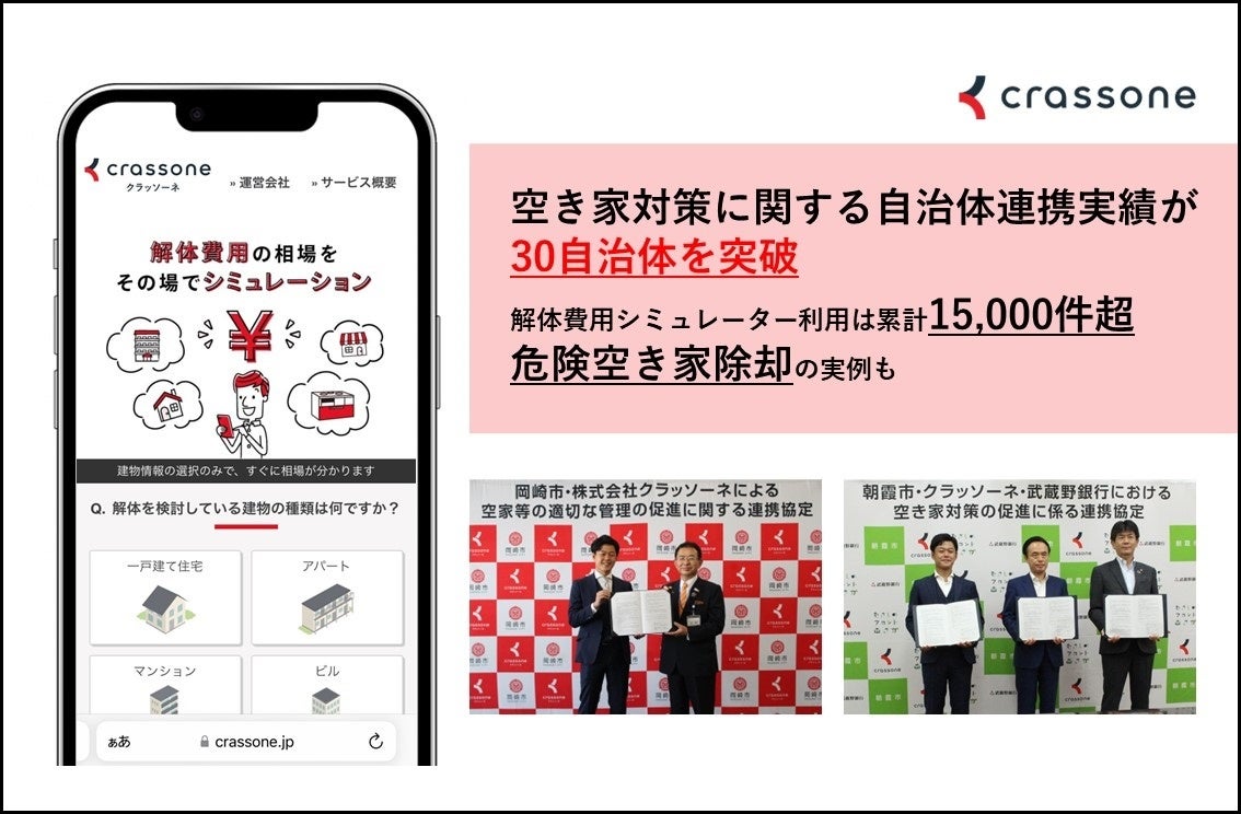 【建設テックのクラッソーネ、空き家対策に関する自治体連携実績が30自治体を突破】解体費用シミュレーター利用は累計16,000件超、危険空き家除却の実例も