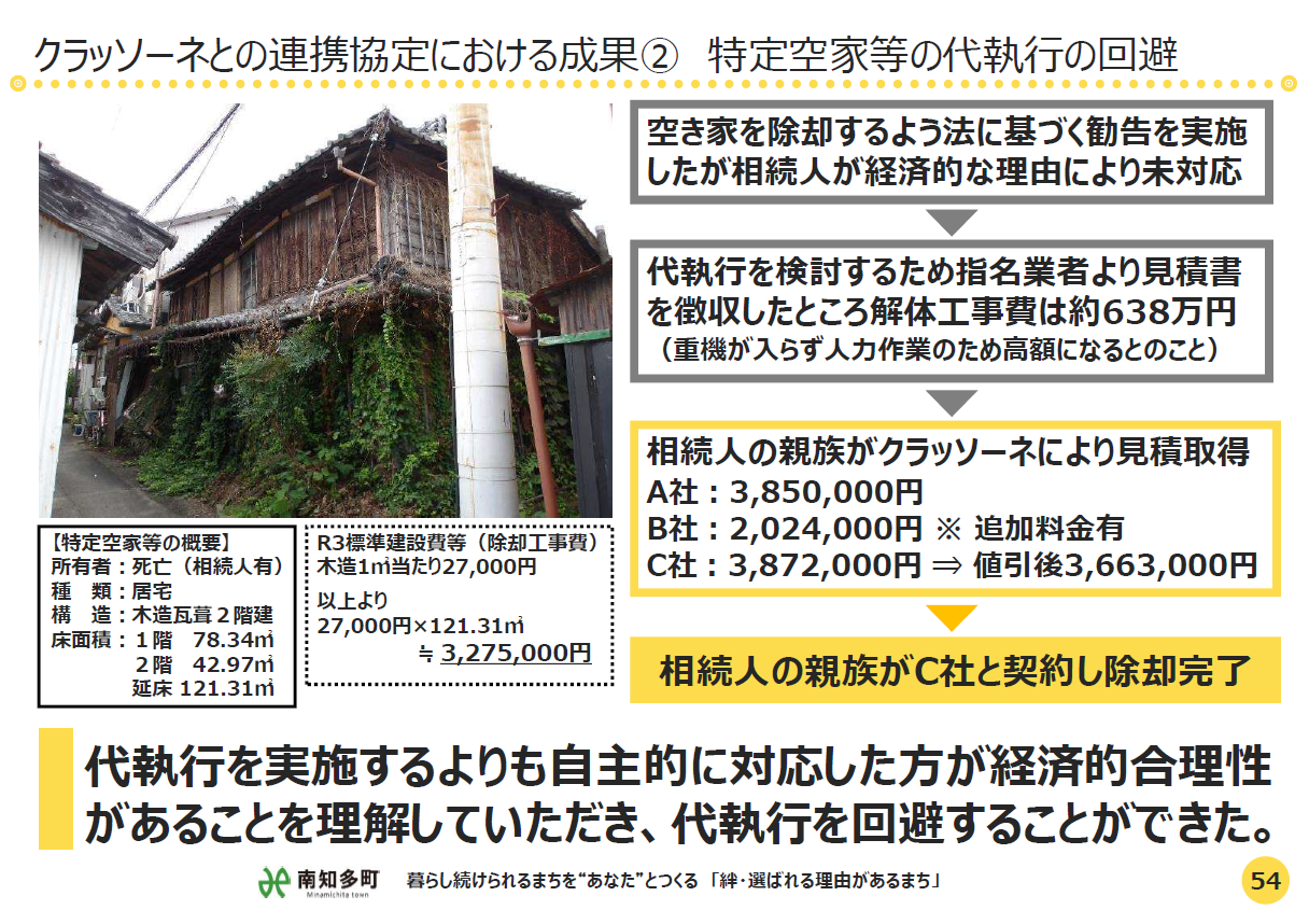 当社との取り組みにより空き家の除却に繋がったケースがあります。約638万円の解体費用がかかると見積もりが出ていた特定空き家等について、一括見積もりサービスにて再度見積もりを取得したところ約366万円と約4割近く費用削減ができたことにより理解が得られ、所有者の親族により解体工事が行われたため、行政代執行を回避することができました。