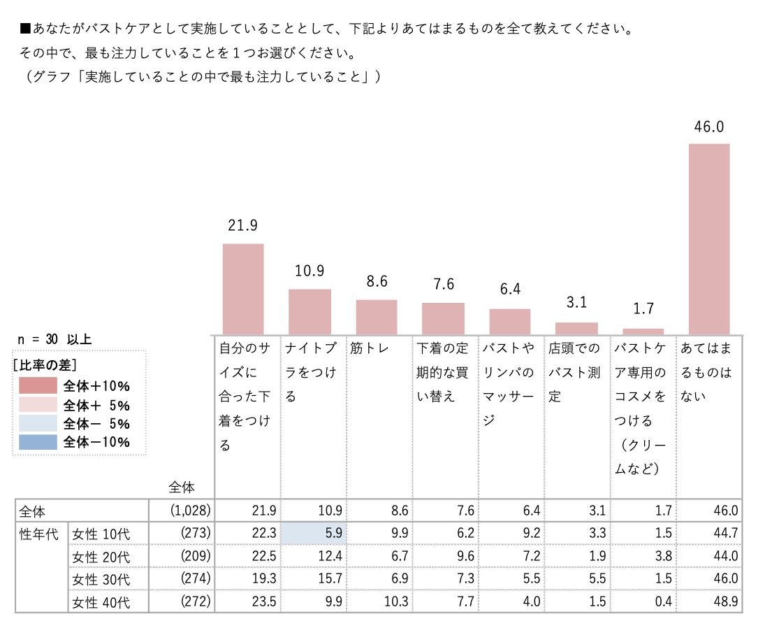 年代別では、30代がナイトブラの着用に最も注力しており15.7%が実施。一方、全体の46.0%が「あてはまるものはない」という回答しており、別のことを実施しているか、特にバストケアを実施していないかもしれません。