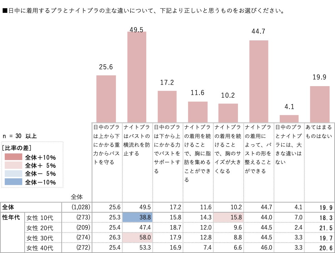 これらの結果から、日中のブラの機能に対する理解を深めるための説明が10代から40代全体に対して求められるかもしれません。ナイトブラに関する正しい知識の浸透は、特に10代向けに強化することが重要と考えられます。