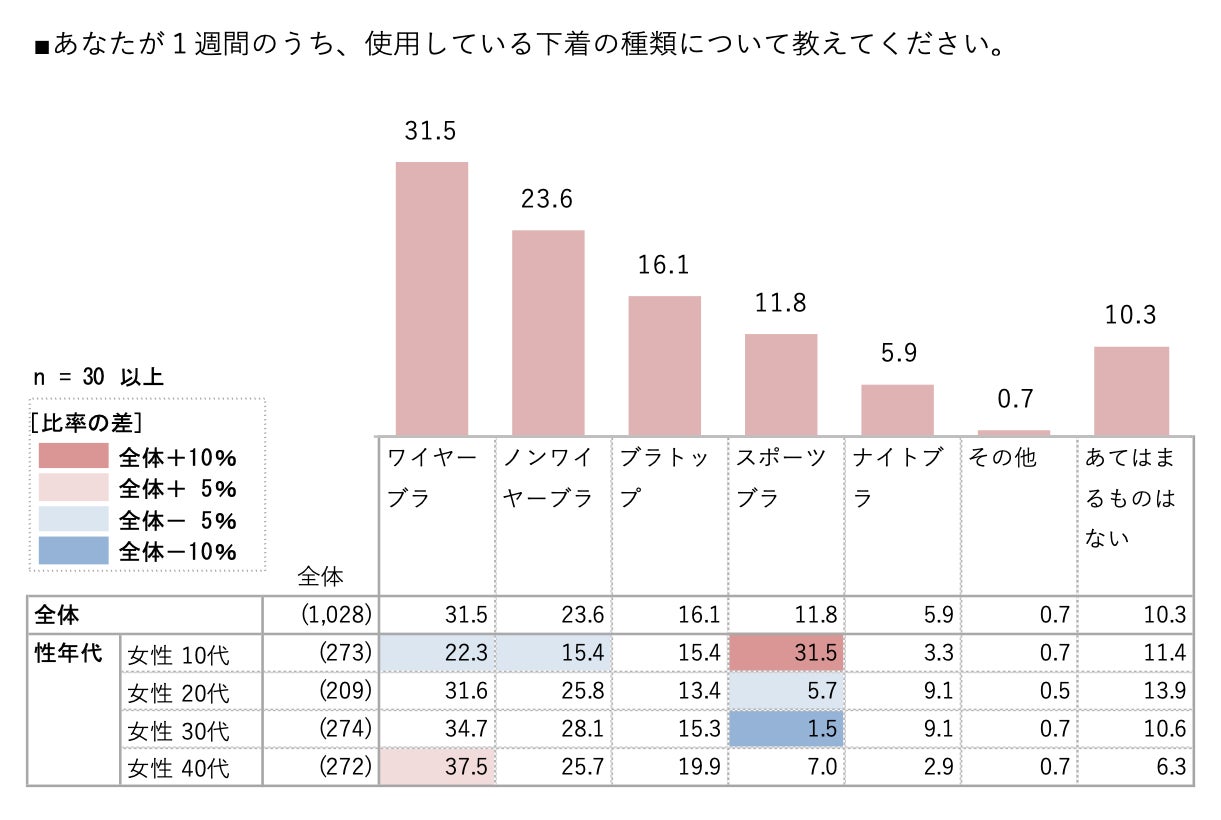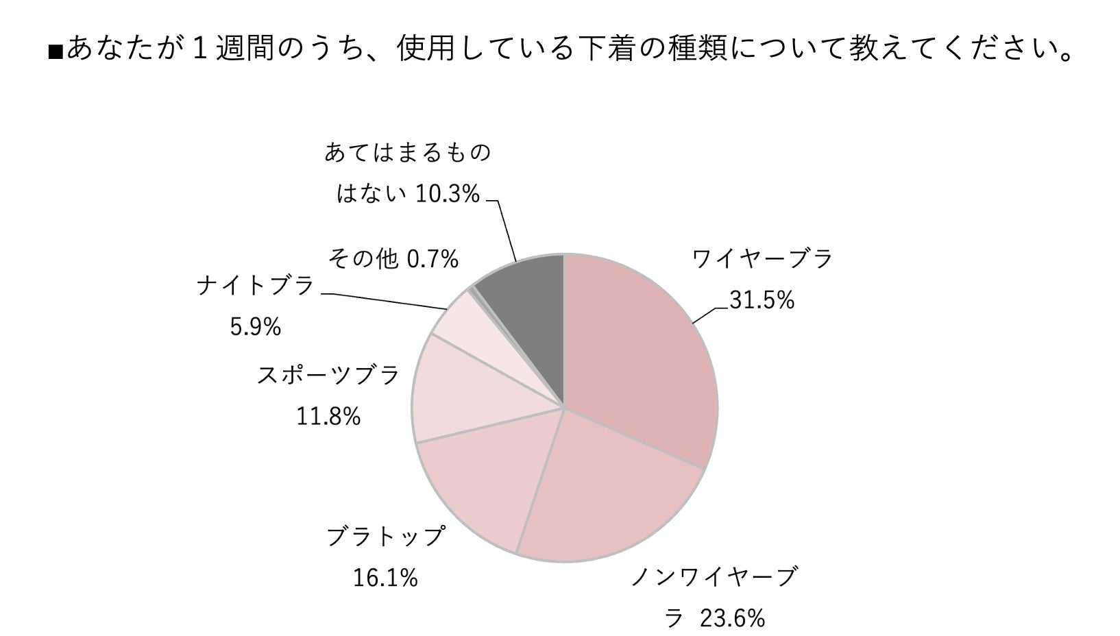 1週間で最も使用されている下着はワイヤーブラ(31.5%)、次いでノンワイヤーブラ(23.6%)、ブラトップ(16.1%)がランクイン。
