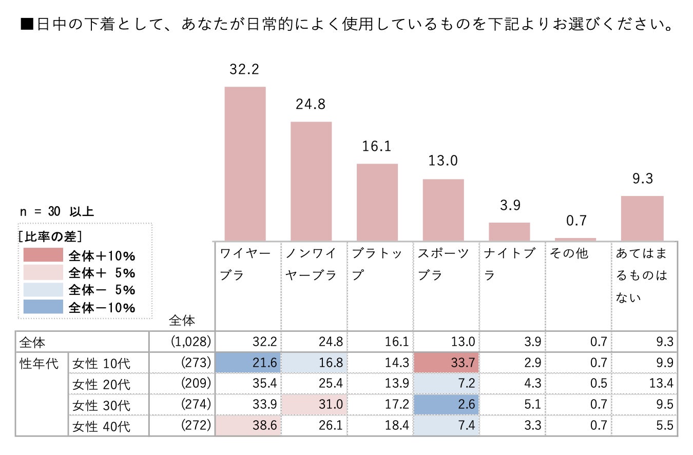 40代女性はワイヤーブラの使用率が高く、日中では38.6%が使用。一方、10代女性はスポーツブラ(33.7%)の使用率が高い傾向。