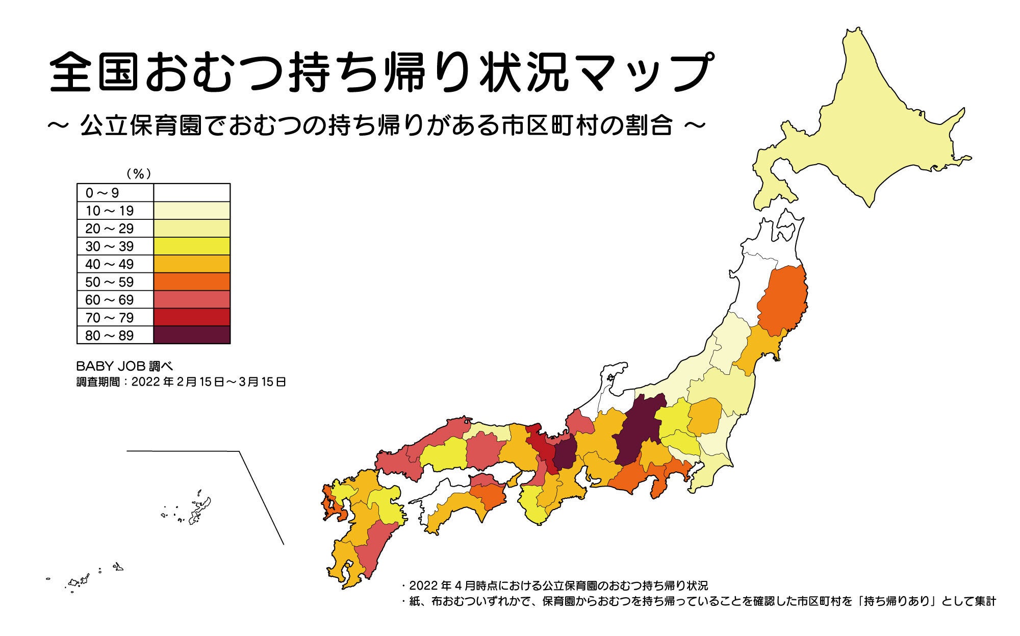 また、公立保育施設においては、各自治体で使用済みおむつの持ち帰りを判断しているため、地域ごとの子育て格差が起きている状況です。2022年2月に「保育園からおむつの持ち帰りをなくす会」が実施した全国調査では、約4割の自治体において、公立保育施設から保護者が使用済みおむつを持ち帰っていることが明らかになりました。