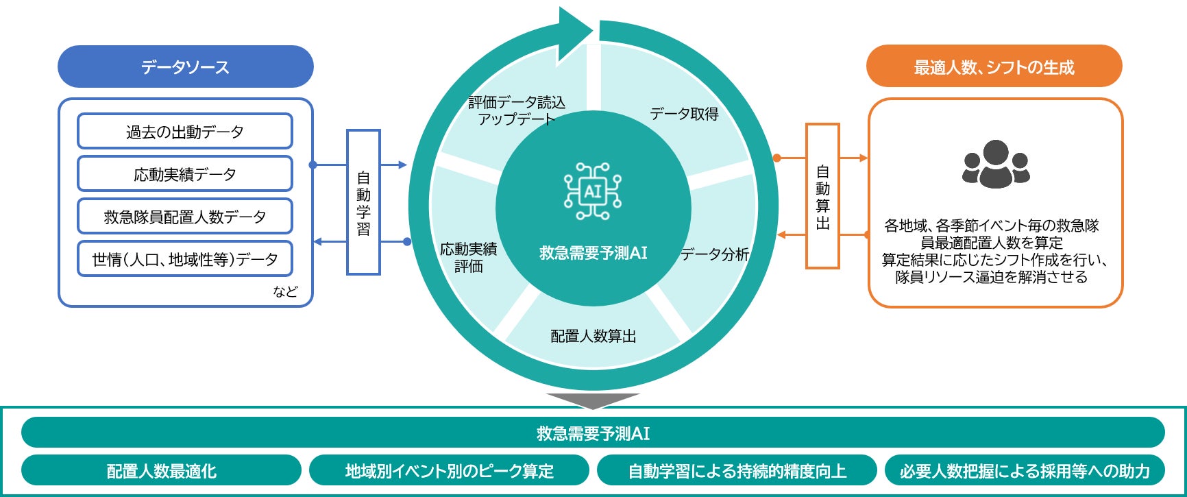 救急需要予測AIは東京消防庁の過去の出動データや応動実績データなどを学習させ、データ取得、分析、算出、評価、アップデートを自動で繰り返しながら、精度を常に向上させていく予定です。