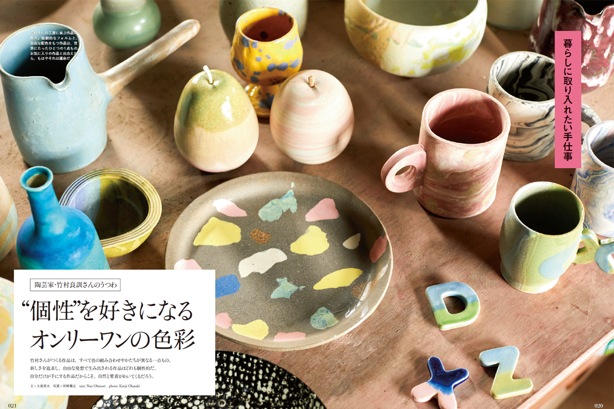 陶芸家・竹村良訓さんがつくるうつわは、すべてが色の組み合わせや形状が異なる一点もの。誌面では、彼の作陶スタイルはもちろん、“もったいない”をきっかけに生まれた、捨てられていた釉薬や土をアップサイクルする作品にも注目しています。世界にたったひとつの“個性”をもった一点ものだからこそ、愛着を育んでいきたいと思える自分の“好き”が見つかるはずです。
