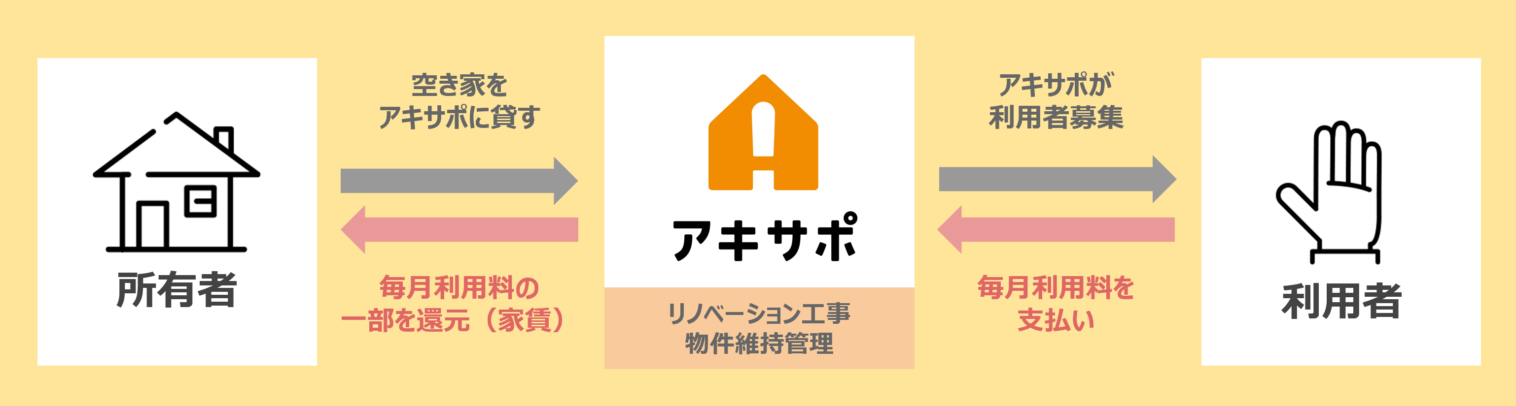 空き家を「アキサポ」が借り受け、「アキサポ」の全額費用負担でリノベーション工事を行い、一定期間転借するサービスです。地域にマッチした空き家活用を提案することで、街の資源である空き家の再生を通じて地域コミュニティの活性化に貢献しております。