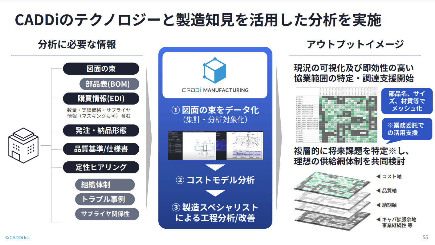 キャディは、既存事業として製造業の受発注サービス『CADDi MANUFACTURING』と、図面データ活用クラウド『CADDi DRAWER』の二つの事業を展開しています。今回提供を開始する『サプライチェーン分析診断サービス』のラインナップも加え、お客様と共に不確実性の特定、積み重ねた暗黙知の形式知化によって、強靭且つ柔軟性を持ったサプライチェーンを構築する支援をしてまいります。