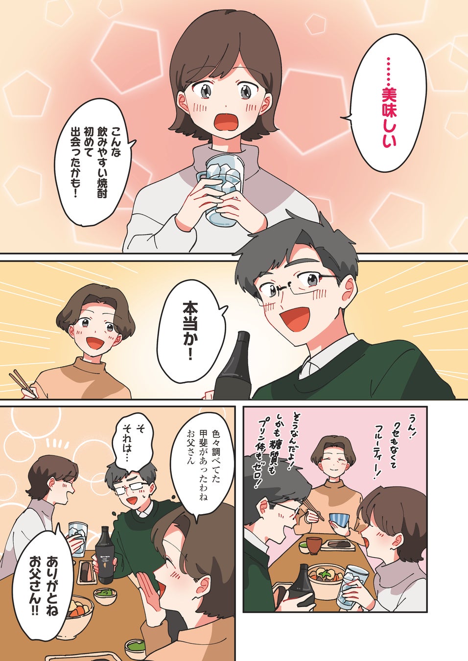 漫画を制作させていただきました、葵山わさびと申します!社会人デビューを控える主人公のやめが焼酎をきっかけに大切な人ともっと近づいたり、特別なシーンを彩る様子を楽しく描かせていただきました。美味しくて飲みやすいお酒は世代問わず手に取りやすく、みんなで美味しさを共有できるところが素敵だな、と思います。漫画を通して、読者の皆様が特別な日の食卓を楽しみたい、と思ってもらえたら幸いです。