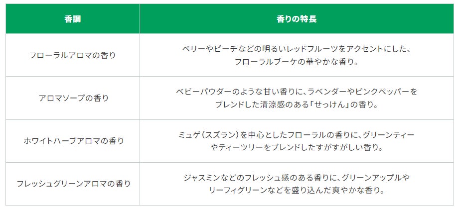 フローラルアロマの香り・アロマソープの香り・ホワイトハーブアロマの香り・フレッシュグリーンアロマの香り